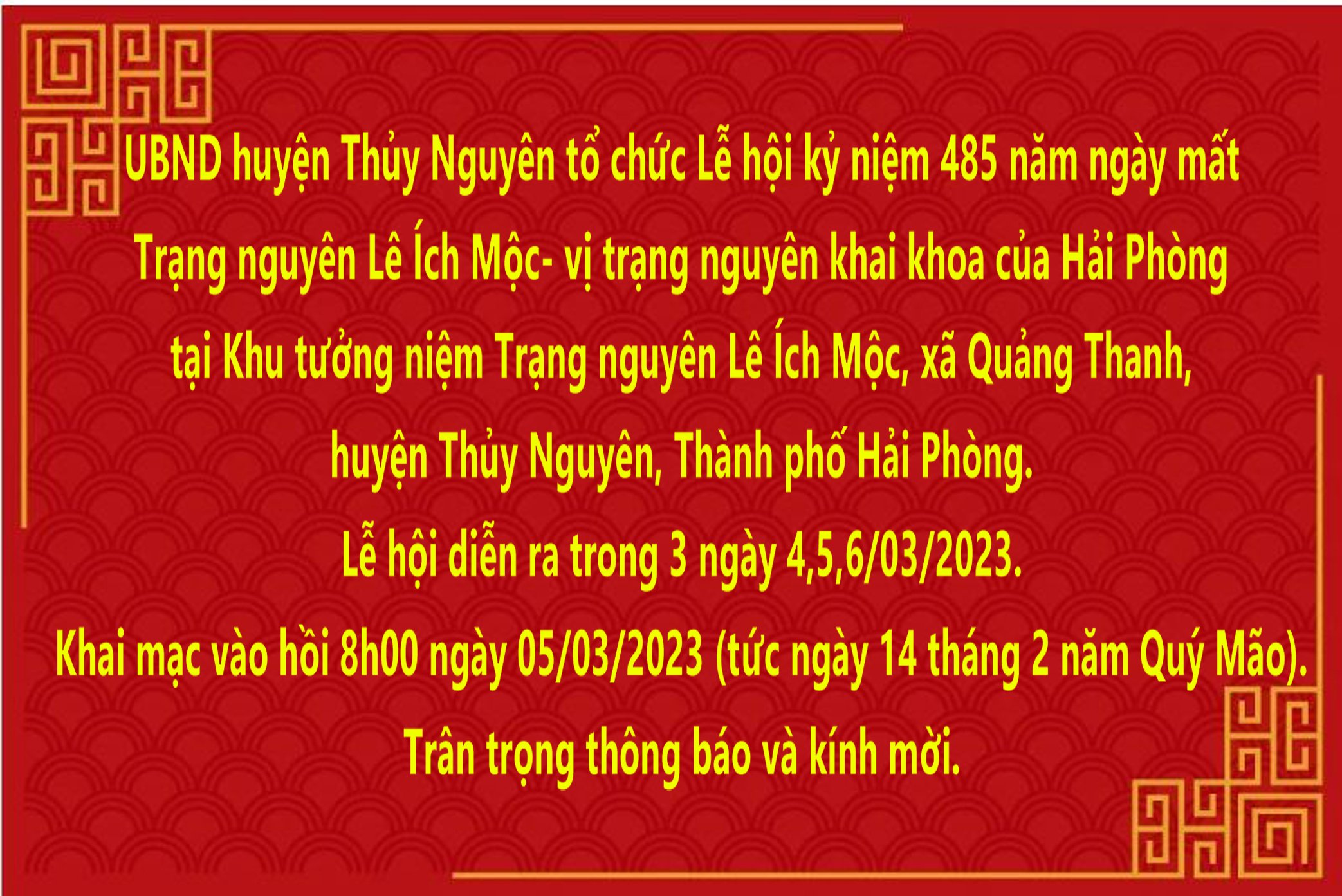 Để báo đáp công ơn to lớn của Trạng Nguyên Lê Ích Mộc. Sáng ngày 5 - 3, Huyện uỷ - UBND Thuỷ Nguyên long trọng tổ chức khai mạc lễ hội kỷ niệm 485 ngày mất Trạng Nguyên Lê Ích Mộc ( 1538-2023). Trung tướng Trần Bá Thiều, Nguyên Tổng cục trưởng Tổng cục chính trị - Bộ công an; Bí thư Huyện uỷ Phạm Văn Thép; Chủ tịch UBND huyện Nguyễn Huy Hoàng cùng đại diện lãnh đạo các sở, ngành, quận, huyện và đông đảo nhân dân địa phương, du khách thập phương về dự.